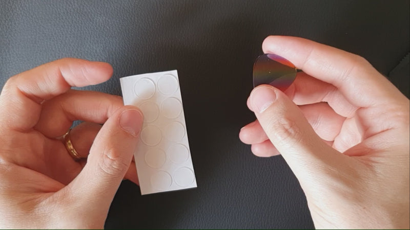 Puoi fissare il tuo plettro utilizzando il biadesivo in gel incluso nella confezione. Questo speciale adesivo garantisce una presa salda senza lasciare residui